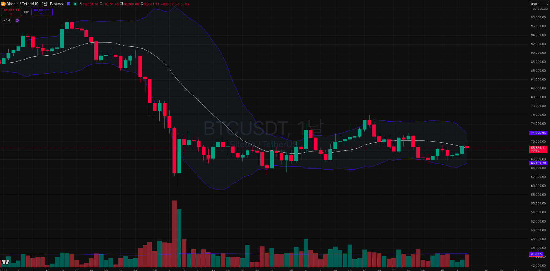 현재 가격은 일봉 기준 볼린저 밴드 중간선과 상단선 사이에 위치해 손익비가 애매한 구간입니다. 공격적인 매수보다는 70,160~70,351달러 저항 돌파 후 되돌림을 확인하거나, 67,914달러 또는 65,000달러 지지에서 반전 신호를 확인한 후 진입하는 것이 승률과 손익비 측면에서 유리합니다.