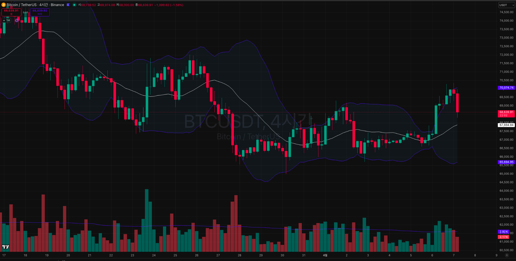 2026년 4월 7일 07시 45분 기준, 비트코인(BTC/USDT)은 69,236달러에서 거래되고 있습니다. 전일 대비 약 0.29% 상승하며 소폭 강세를 유지하는 모습입니다. 일봉 기준으로는 볼린저 밴드 중간선 위에 안착을 시도하고 있으며, 4시간봉 기준으로는 저점 65,000달러 대비 강력한 반등이 진행 중입니다. 결론부터 말하면, 현재 비트코인은 뚜렷한 방향성이 없는 횡보 구간 내에서 단기 매수 우위 상태를 유지하고 있으며, 상방으로는 70,160~70,351달러, 하방으로는 65,000달러가 핵심 분기점입니다.