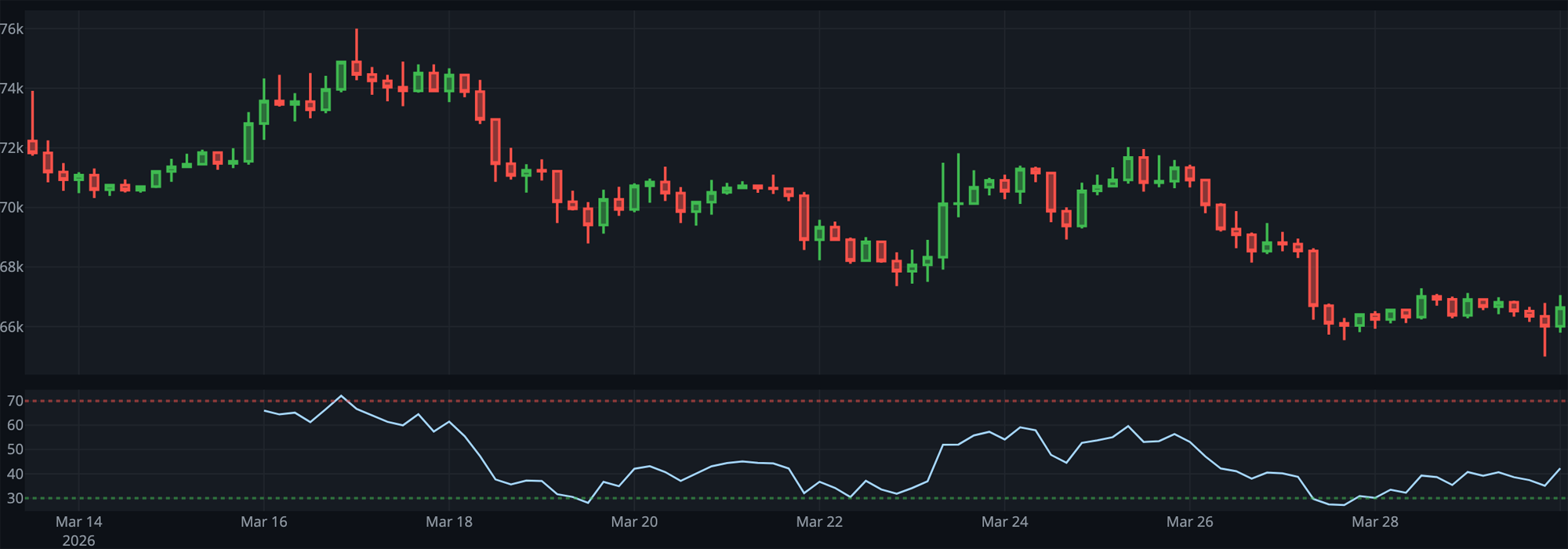 2026년 3월 30일 기준, 비트코인(BTC/USDT)은 현재 $66,712 수준에서 거래되며 핵심 지지 구간인 $65,000~$65,221에 빠르게 근접하고 있습니다. 일봉 기준 ADX 17.0은 강한 추세가 부재한 거래 범위 국면을 나타내며, 4시간봉 기준 ADX 33.86은 이 하락이 단순한 노이즈가 아닌 추세적 힘을 가진 하락 스파이크임을 시사합니다. 오늘 분석의 핵심 질문은 하나입니다. $65,000 지지선에서 반전 신호가 나오는가, 아니면 하향 돌파로 추세 전환이 시작되는가. 이 구간에서의 가격 행동이 향후 방향성을 결정짓는 가장 중요한 변수입니다.