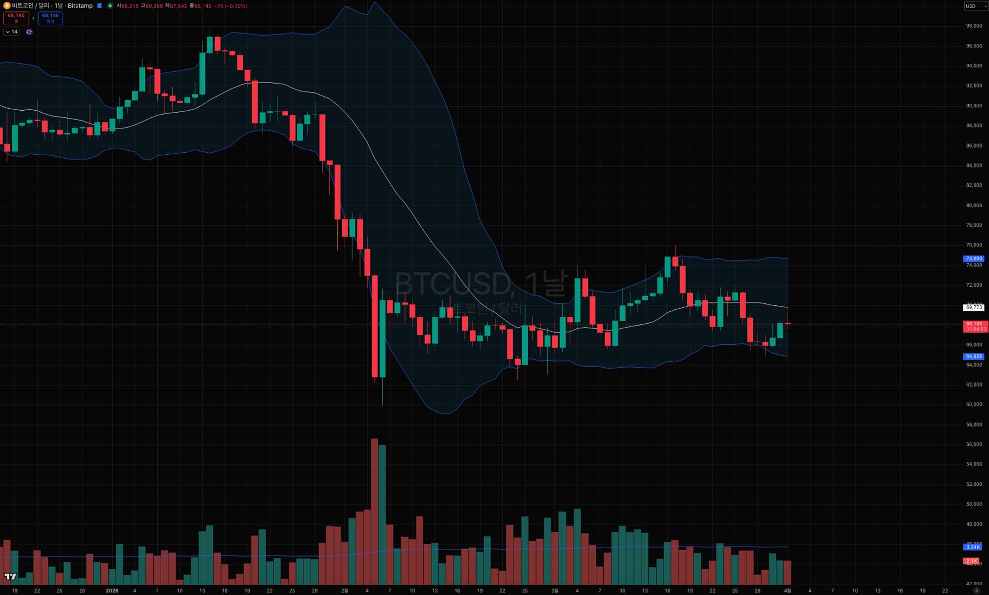 | 1차 저항 | $69,801 | 볼린저 밴드 중간선 (20일 이동평균), 단기 핵심 분기점 |