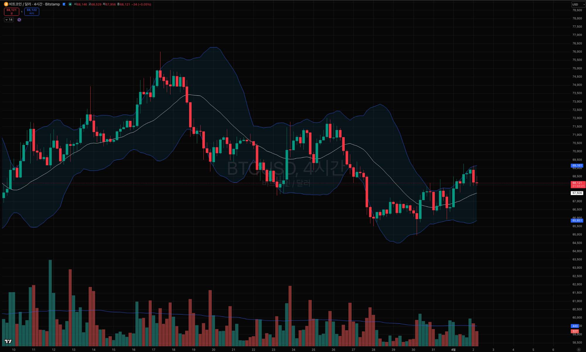 | 1차 지지 | $67,570 | 4시간 볼린저 밴드 중간선, 단기 상승 유지 기준선 |